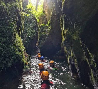 Canyon aquatique composé de deux beaux encaissements séparés par une courte marche en forêt.